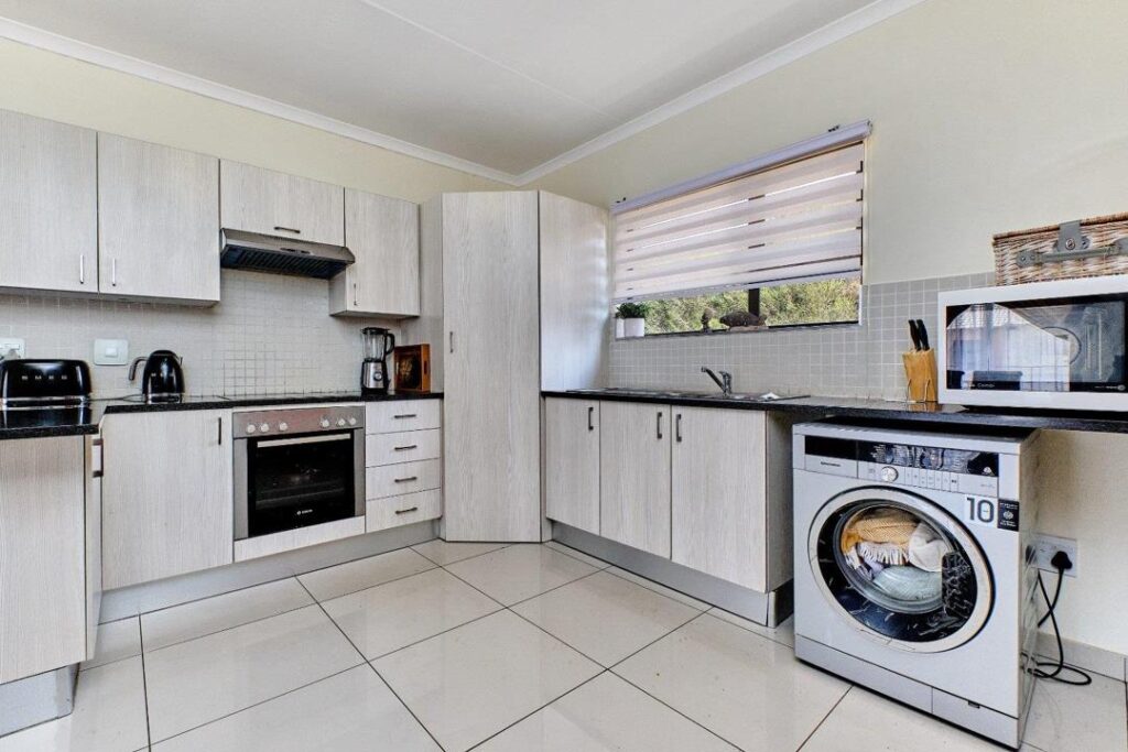 The property is open plan with sufficient space flowing through the living area into the dining area. The spacious kitchen is fitted with melamine tops and off-white cupboards.